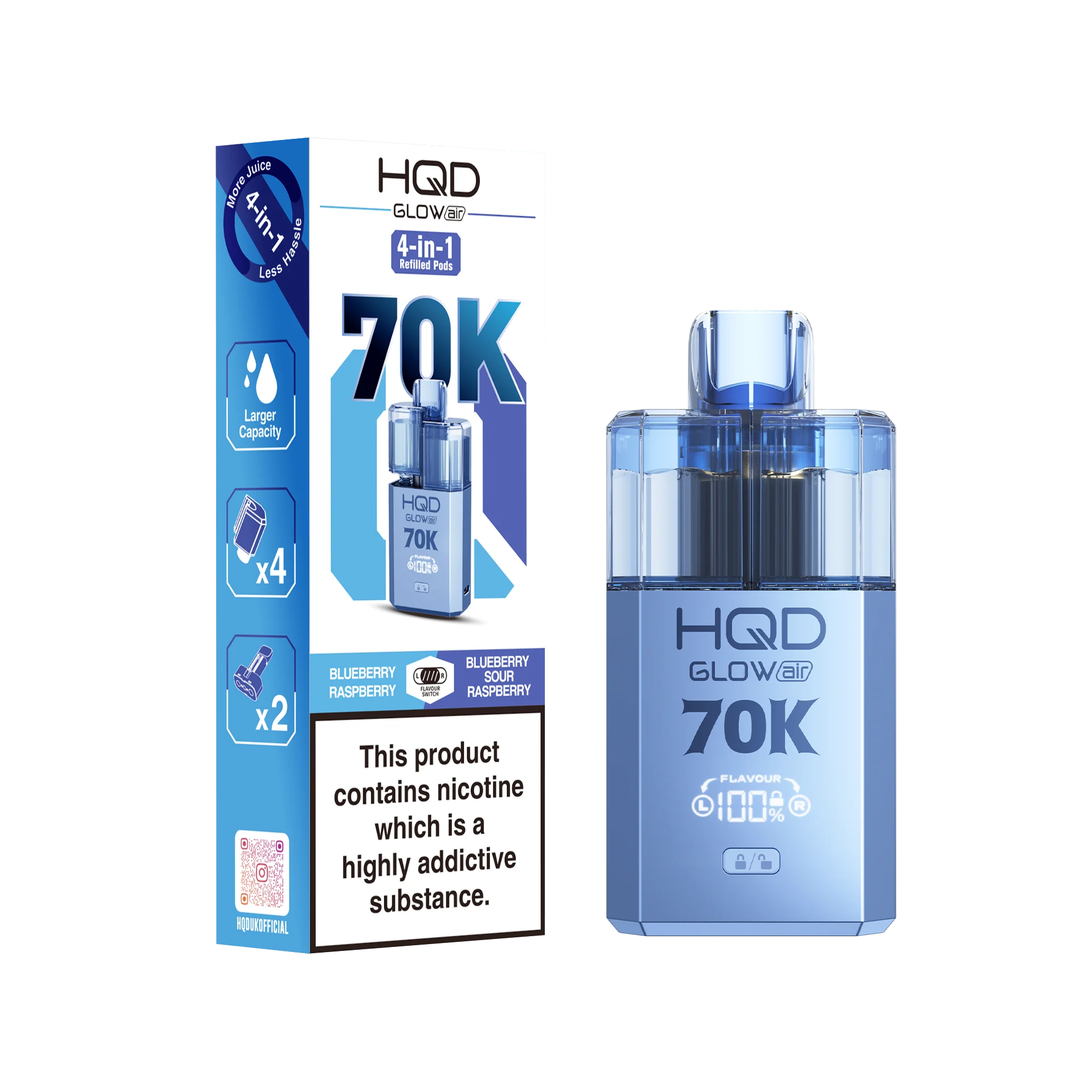 Experience the HQD Glow Air 70K – Kit – Blueberry Raspberry & Blueberry Sour Raspberry, a rechargeable pre-filled vape delivering up to 70,000 puffs of smooth, rich flavour. Compact, consistent, and fully TPD compliant for the UK market.